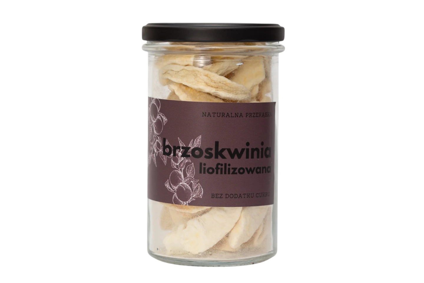 Naturalna, chrupiąca brzoskwinia bez cukru – 100% owoc. Liofilizowana, bogata w witaminy, zamknięta w szklanym słoiczku. Idealna do jogurtów i owsianek.