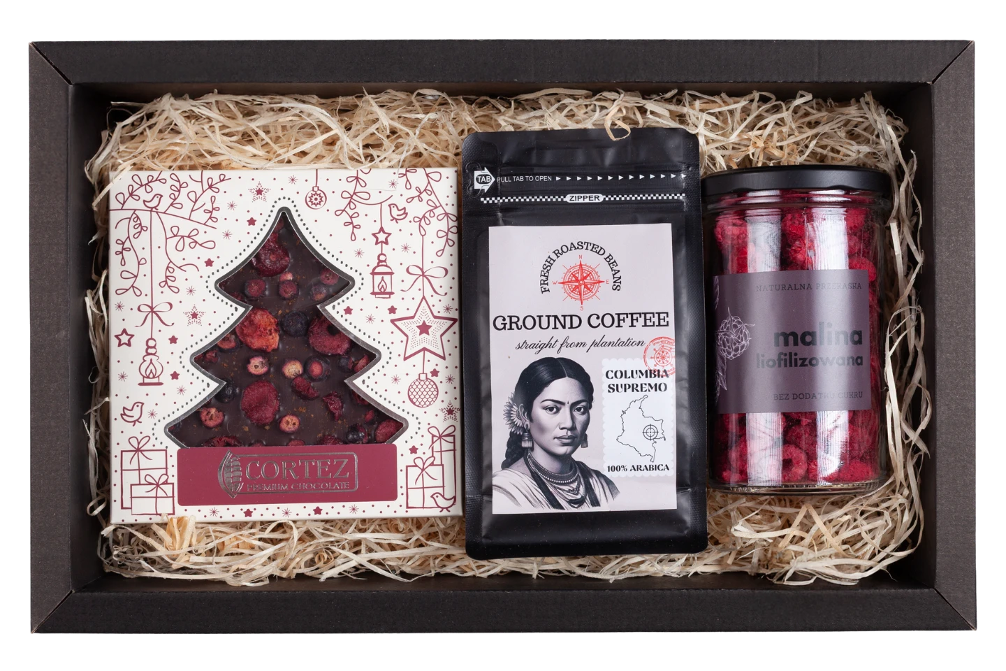 Świąteczny zestaw prezentowy z kawą, czekoladą w świątecznym opakowaniu i naturalną maliną liofilizowaną. Gotowy do wręczenia. Pudełko ma wymiary 40 x 25 x 10 cm.