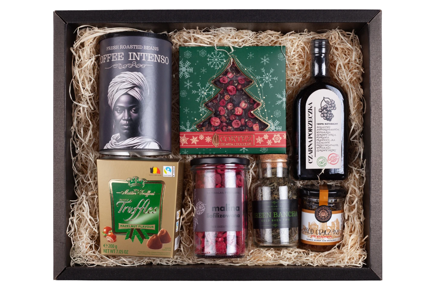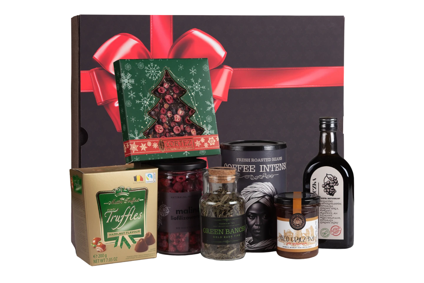 Bogaty świąteczny zestaw prezentowy z intensywną kawą, zieloną herbatą, miodem, syropem, liofilizowaną maliną i słodkościami. Elegancko zapakowany – gotowy do wręczenia. Pudełko ma wymiary 37 x 45 x 10 cm.