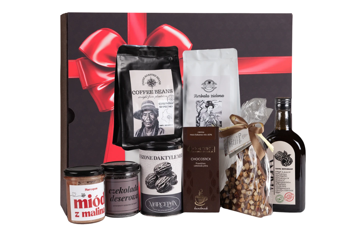Zestaw świąteczny z rzemieślniczą kawą, herbatą Bancha, miodem malinowym, czekoladą w różnych formach i syropem owocowym. Zapakowany na prezent – gotowy do wręczenia. Pudełko ma wymiary 37 x 45 x 10 cm.